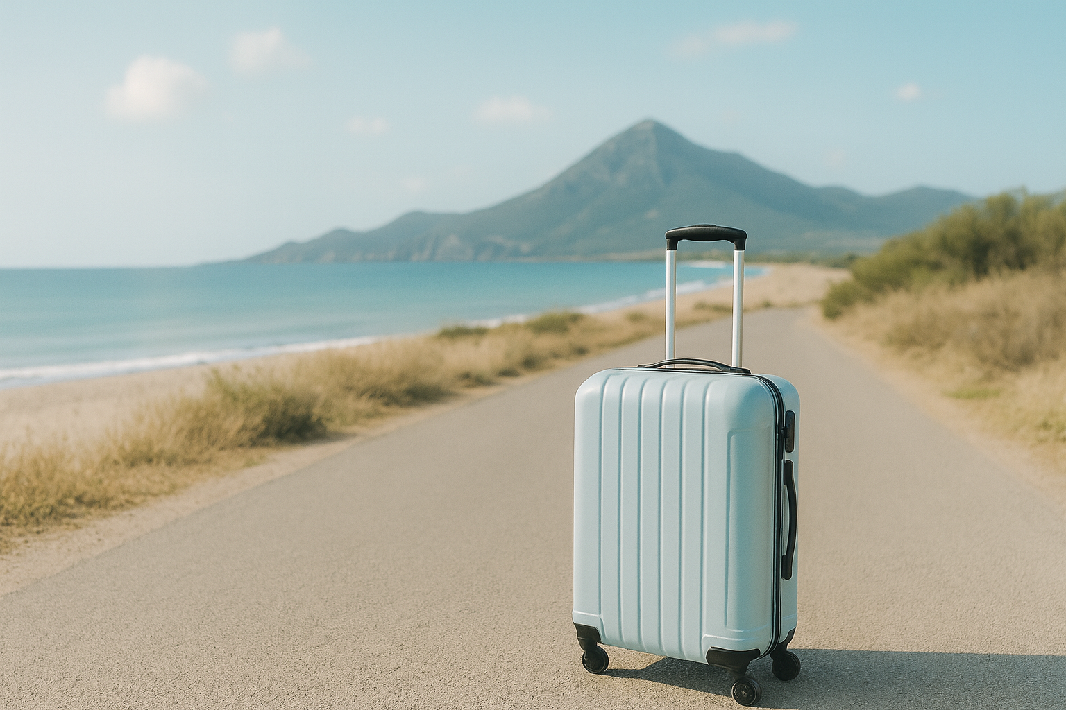 A light blue hard-shell suitcase on four wheels standing on a coastal road with a mountain in the background, near the ocean and sandy shoreline under a partly cloudy sky.